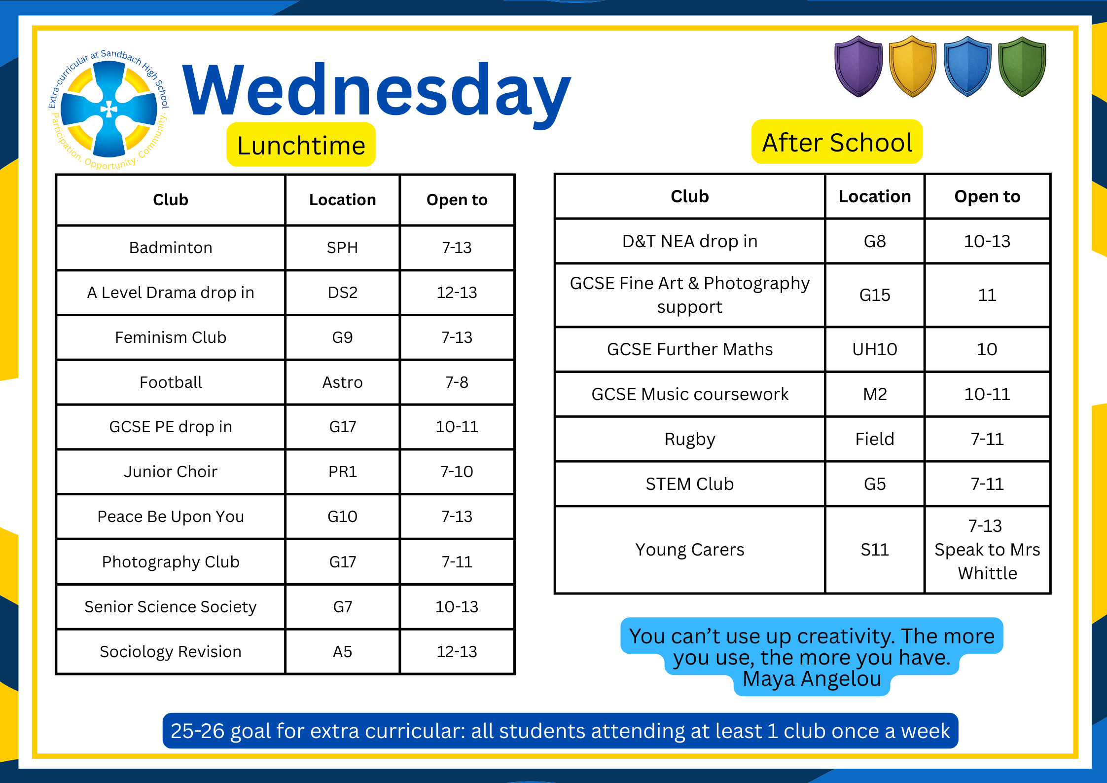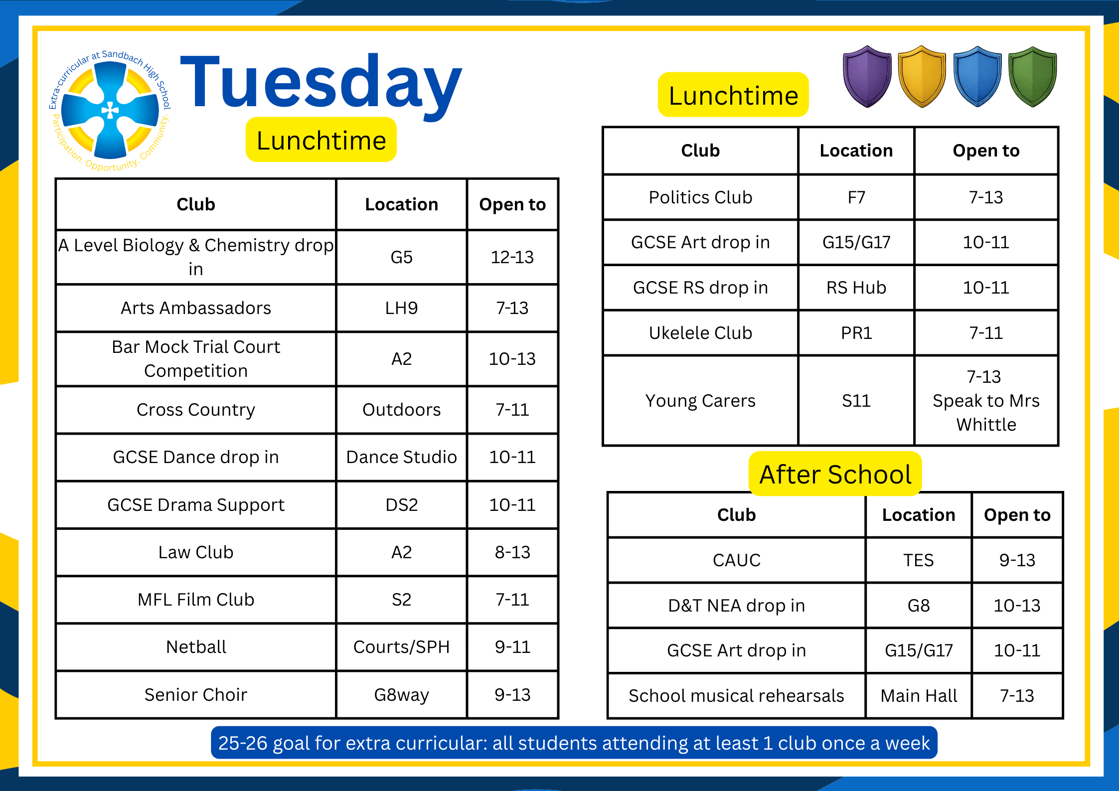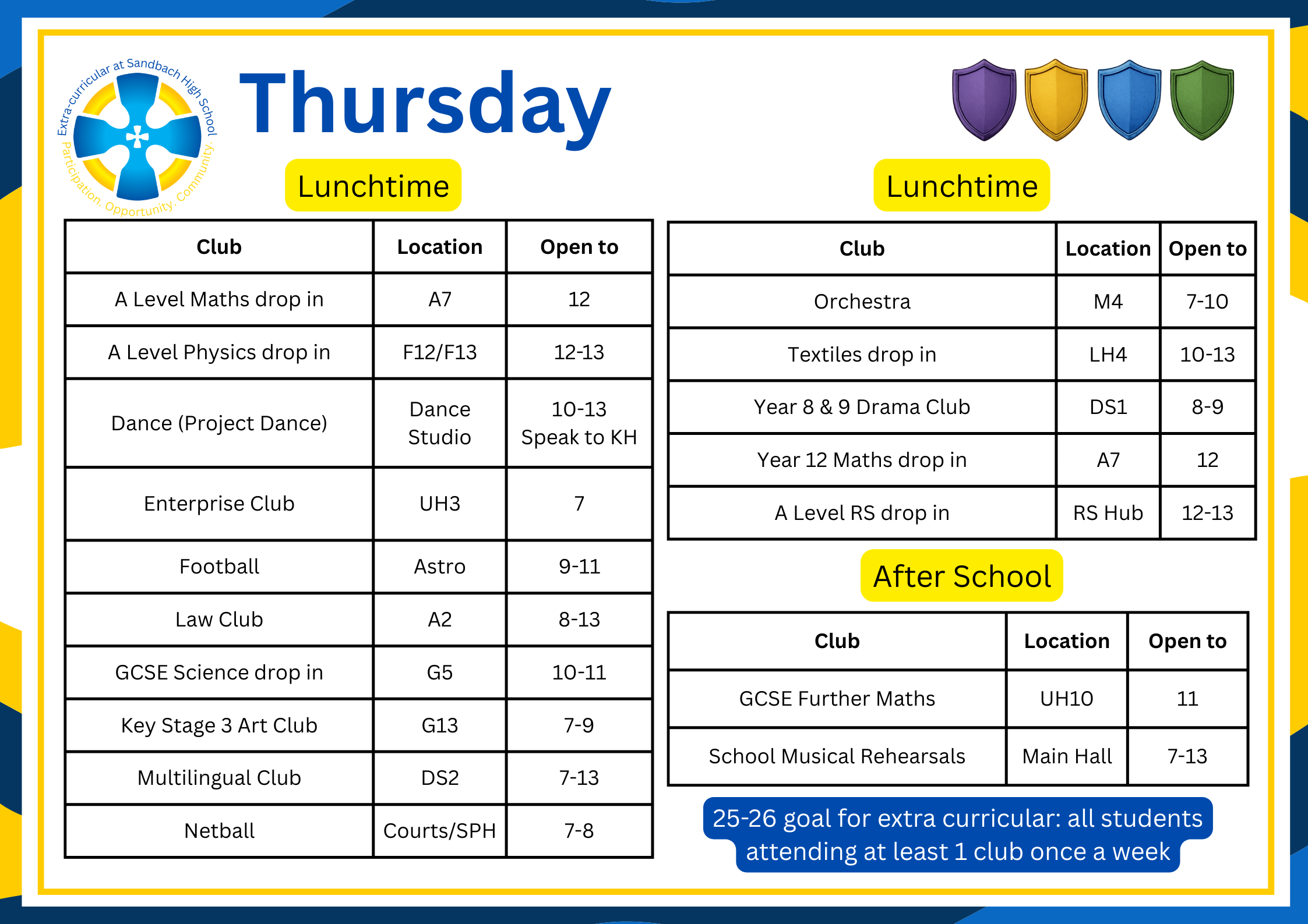 There are over 100 extra-curricular clubs available for students to join, all the information about them is available on Edulink. Below the timetable is a list of clubs available.