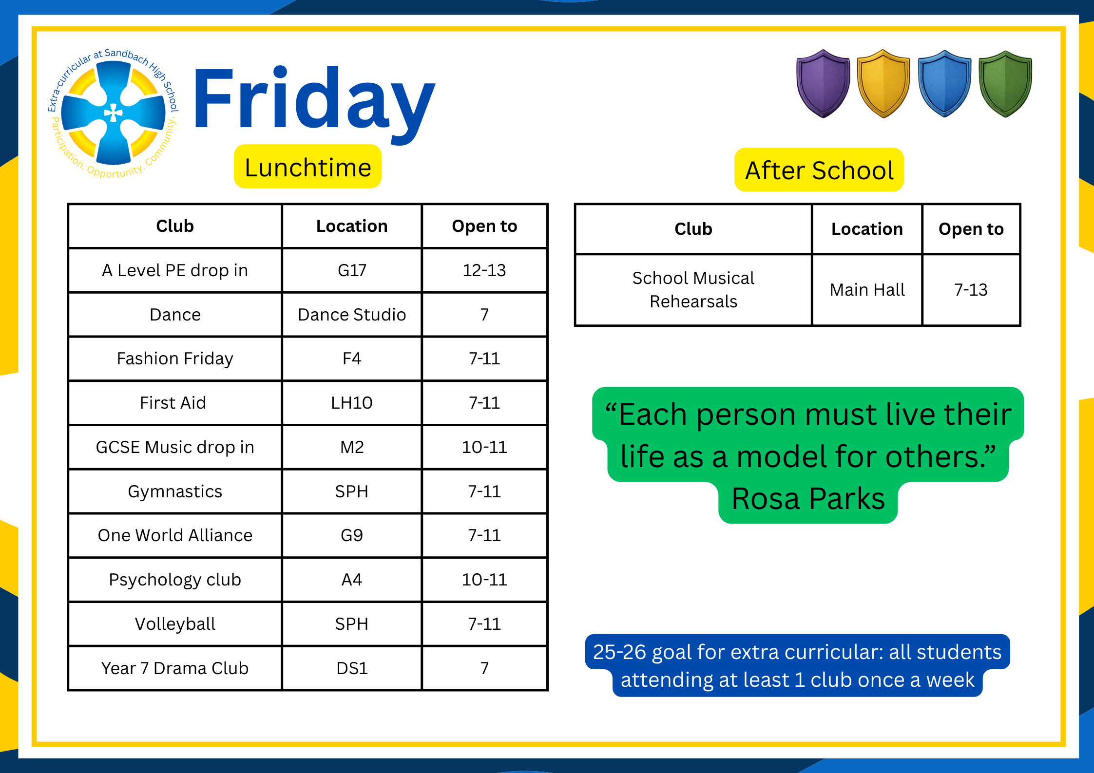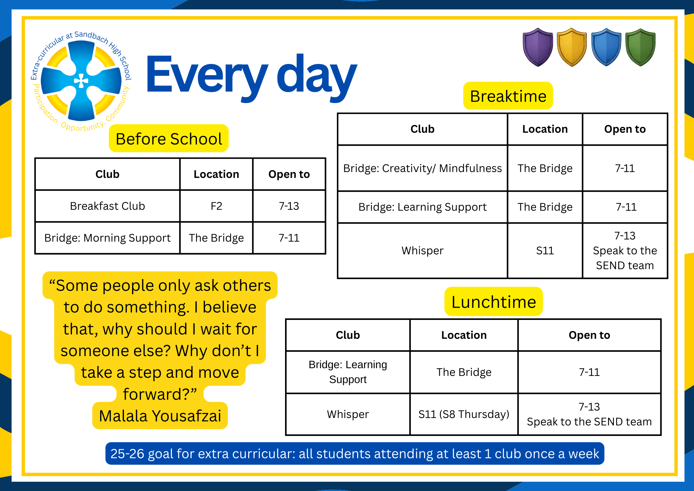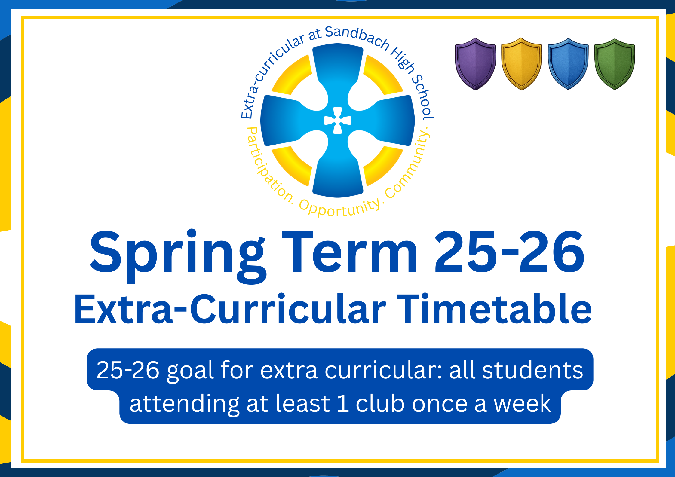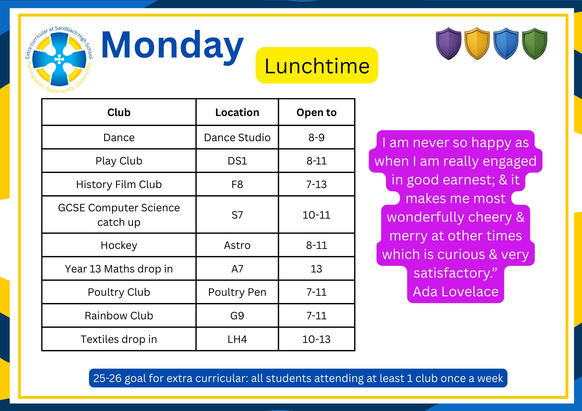 There are over 100 extra-curricular clubs available for students to join, all the information about them is available on Edulink. Below the timetable is a list of clubs available.